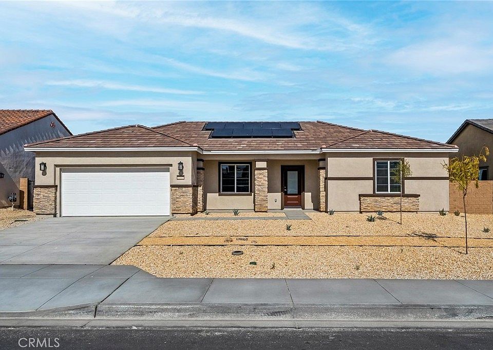 Make a lasting impression with this gorgeous new construction home in Apple Valley. Designed for modern living, this single-story home offers three bedrooms and two bathrooms, exuding charm and warmth throughout. The open-concept layout seamlessly connects the kitchen and family room, making it the perfect space for entertaining. Retreat to the master suite, which features a luxurious en-suite bathroom with a spacious shower and a walk-in closet. This home includes an array of high-end upgrades at no additional cost, such as granite countertops, energy-efficient kitchen appliances, a Wi-Fi-enabled garage door opener, solar panels, and more.