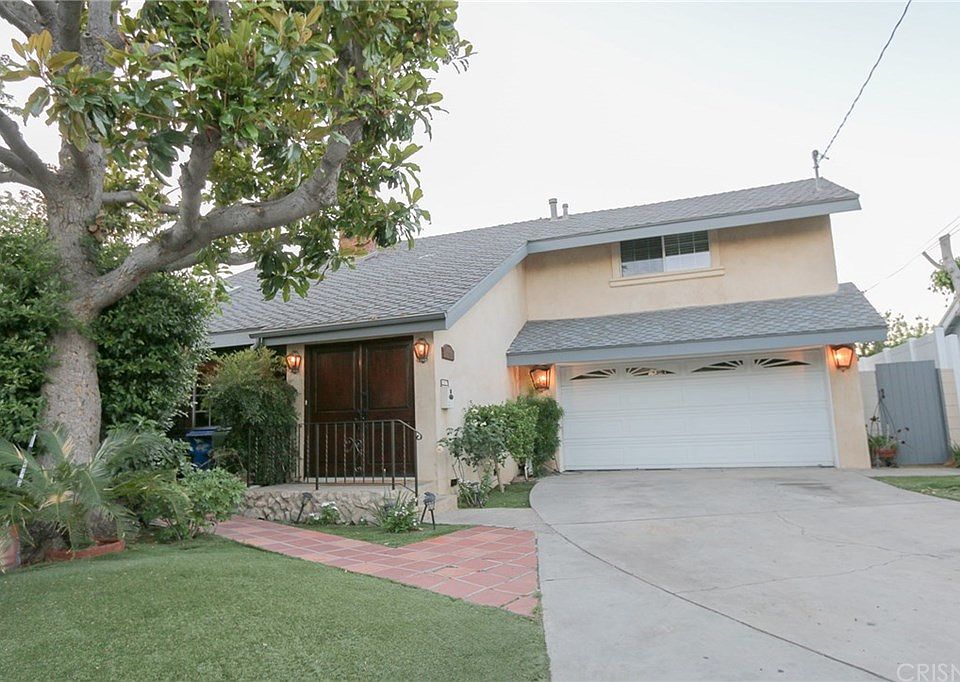 Two-story home located on a cul-de-sac street in a tree lined neighborhood in the heart of Van Nuys. This is a 3 bedroom and a 2.5 bathroom with an open floor plan. Indoor has been newly painted with accents of Venetian plaster in some rooms. As you walk in, you are greeted by the family room that features vaulted ceilings, marble flooring, limestone cast mantel that holds a double fireplace. The kitchen has an open floor plan which includes porcelain tile wood-like floors, custom design marble counter tops, an island, and beautiful back-splash, newer cabinetry and recessed lighting. There is a dining room space next to the kitchen that also holds a small wet bar and a half bathroom. Access to an entertainers backyard from the kitchen which even includes a newly built tree house. Backyard has artificial grass with extra space on side of house. The second floor holds all 3 bedrooms and a 1 and 3/4 bathroom. Hallway and bedroom have engineered hardwood flooring. The master bedroom has been recently painted and master bathroom has a new vanity and mirror along with new wood-like porcelain tile. The other two bedrooms share the full-size bathroom located in the hallway upstairs. The laundry room in located downstairs in the garage. The front of the house also has artificial grass for easier maintenance and a large driveway.