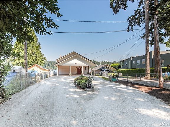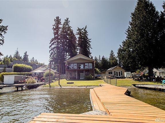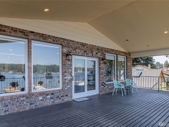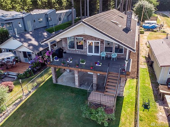 Lake Goodwin 3000+ sq ft brick home w/apx 42' of your own lakefront to enjoy. Take in the views from the open concept kitchen w/storage galore, eating bar, and two ovens to make entraining a breeze. Dining area & living room are surrounded with Plenty of windows to bring the outside in. Enjoy your waterfront living from your generous sized covered deck or moonlight dinning on your dock! Main level master has a large double entry walk-in closet & a step up alcove for a sitting room craft space or office area. Possibilities are endless with the Daylight basement with an oversized bonus/rec rm, bedroom, den, full bath with jetted tub, 2nd fireplace, & its own waterfront patio. Large 3-car carport plus interior shop & 8x16' wooden shed.