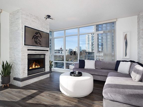 Bright 2 bed, 2 bath + den corner suite at the Waterford, with 1,075 sq ft of smartly designed living. Floor-to-ceiling windows enhance the open kitchen, dining & living areas with natural light, modern flooring & a stone fireplace. A high-efficiency heat pump with A/C keeps the suite comfortable year-round. Includes secure EV-ready parking & EV bike charging. The versatile den is ideal for a home office or reading nook, while the corner position enhances city & sunset views. Located in a well-managed building with the envelope updated last year, this suite is just steps to the seawall, David Lam Park, shops, dining & the Aquabus, combining modern comfort with an unbeatable waterfront lifestyle.