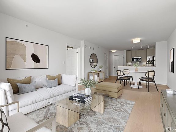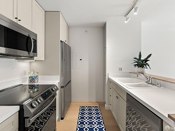 Chic condo in a doorman building without the doorman price! You'll forget you are in the center of the city when you enter this quiet courtyard setting condo. Flooded with western light and newly updated makes it ready to move right in. Off the entry is a galley kitchen with a new appliance suite inc. a freezer w/ ice maker and tons of cabinets for all your kitchen gadgets. The open concept great room allows for separate dining and living zones. The large bedroom has a large walk-in closet, wall-to-wall closet and connects directly to the bath featuring a 6' vanity! Plenty of options for a home office whether it be the nook in the bedroom or the 8' long floor-to-ceiling bay window alcove. New gorgeous white oak engineered floors, new plush carpet, fresh paint throughout, refreshed cabinetry and hardware, new light fixtures, bath fixtures and Toto toilet. The condo includes in-unit internet, in-unit laundry and 1-car pkg. Residents enjoy 24x7 doorman security, package service, gym, hot tub, sauna, shared outdoor space and grand library lobby. Common areas have WiFi perfect for WFH. Strong HOA reserves. Enjoy nearby Lafayette Park, Polk St. Japan Town, Fillmore St. Hayes Valley. Whole Foods 2-blocks, Trader Joe's nearby. Tech shuttles and MUNI 2, 19, 38, 49 lines nearby.