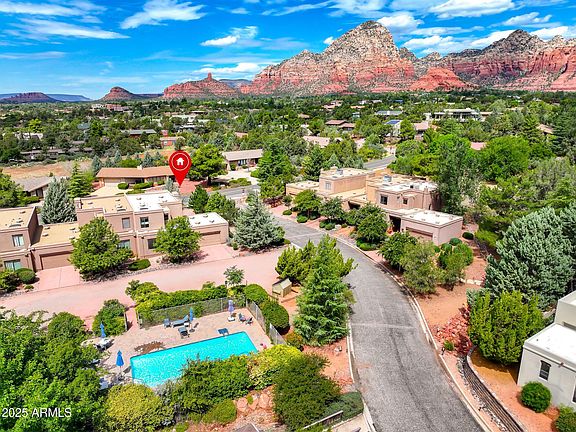 Lock & Leave Luxury! Sedona & it's nature playground are calling you to make your home in this beautiful condo...built in 2011 & feels like new, this property shines amongst all others here in stunning Sedona. Perfect end unit placement with beautiful Red Rock views from primary bedroom, primary bathroom, guest room, living room, balcony, & back patio. Privacy abounds plus a two car garage & extra storage closets inside home. Don't forget the prime location is one block from Whole Foods, & three blocks away Posse Grounds Park where you can experience our Sedona Dog Park, walking/biking paths, community ball fields including pickleball, concerts, movies in the park, & community events. Lovingly maintained home with HOA that covers water, trash, community clubhouse & pool. No rentals shorter than six months. Kind, friendly neighbors where subdivision gatherings & potlucks are held on a seasonal basis. Less than a mile to some of Sedona's most coveted hiking trailheads.