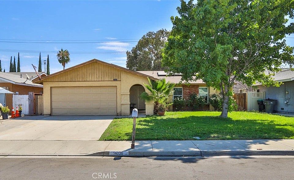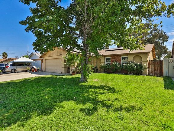 Single family, single story home sitting on 8712 square foot lot! Nice curb appeal with lush green lawn, mature landscaping, and a covered/arched entryway! Features include: Solar panels installed in 2018, and Windows, Furnace, AC, & water heater were upgraded/updated too! Spacious rooms including the Kitchen which is open to the living room! Primary bedroom and bathroom, plus a 2nd bedroom & full bathroom! HUGE back yard with plenty of room to spread out with block walls along the back, and newer vinyl fencing on one side too! Great location not far from the 215/60 freeways, Lake Perris Recreation area, March Airforce Base, Kaiser, Shopping, Restaurants, and more!