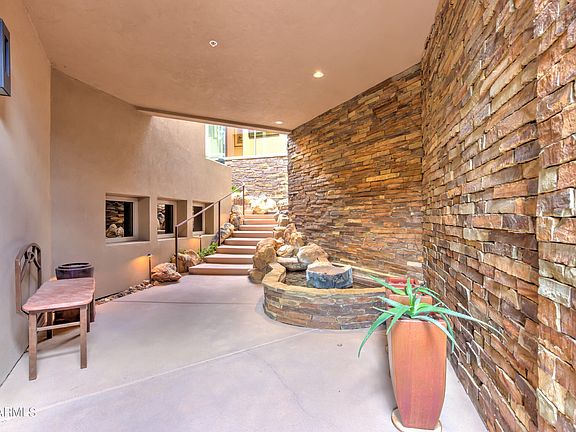 Frank Lloyd Wright-inspired contemporary home tucked in the west end of Sunridge Canyon, bordered by open public land for outstanding privacy and views. Double‑gated access and a long private drive lead to a modern design of steel, glass, and clean architectural lines. The dramatic 18‑foot custom iron and glass entry opens to spacious living areas with soaring ceilings, walls of glass with motorized blinds, and a sleek fireplace framed by sculptural metal panels concealing a hidden TV. The gourmet kitchen features imported Italian cabinetry and high‑end Gaggenau and Thermador appliances. Designed for comfort, style, and connection to its desert setting, this home offers refined living in one of Fountain Hills' most desirable communities.