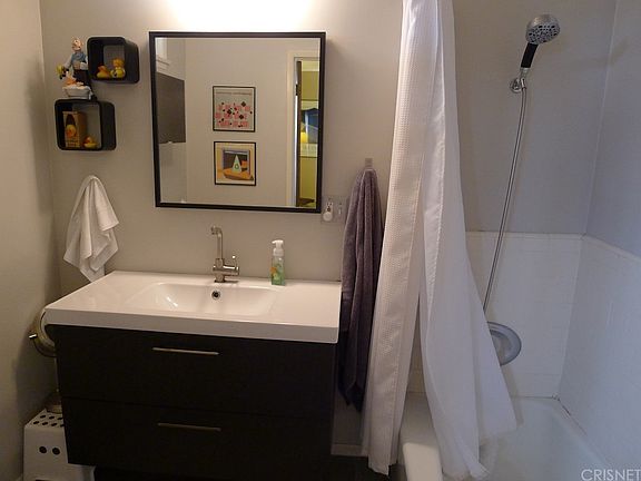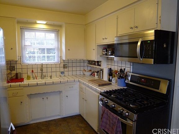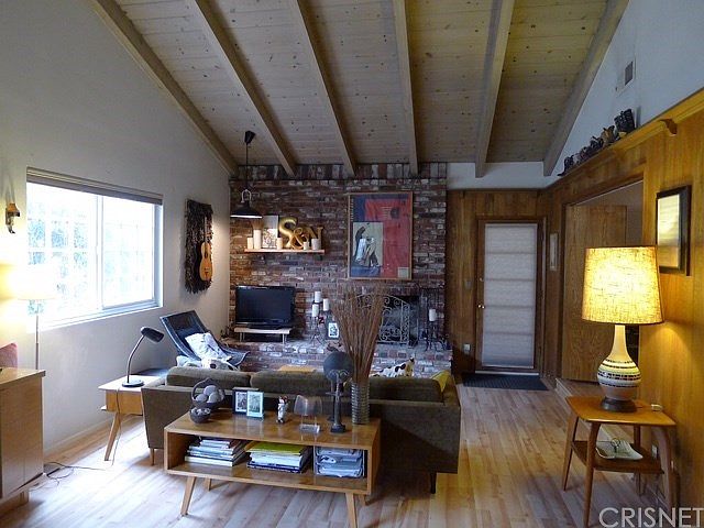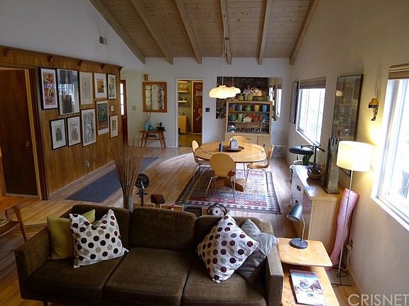 Charming and sophisticated home with stylish mid-century character sited in the heart of SFV. Included in the kitchen are newer SS appliances and custom shelving. Featured in the living room and formal dine area are beautiful vaulted 14' beamed ceilings and an impressive brick wall and FP with hearth. The large master suite has two big closets, one a walk-in. Added space is a bright enclosed sunroom. Upgrades include new copper plumbing, double glazed windows with custom coverings, updated baths and new laminated flooring. The garage is insulated and finished with loads of storage. A whimsical back yard is planted with drought resistant plants and fruit trees. Currently, the 3rd BR is used as an office and is open to the living area.