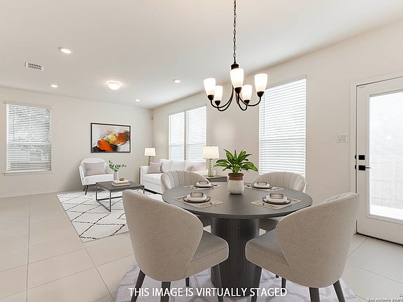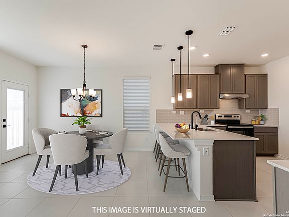 Built in 2023, this modern home perfectly blends contemporary design, comfort, and convenience. Nestled in a highly desirable community with quick access to La Cantera, The Rim, Six Flags, the Medical Center, and just minutes to Downtown San Antonio and Boerne, this residence offers both a vibrant lifestyle and everyday ease. Step inside to an open-concept floor plan designed for seamless living and entertaining. The kitchen features Whirlpool stainless steel appliances, Woodmont Dakota Shaker panel 42-inch upper cabinets, and stunning Silestone Blanco Maple countertops. The elegant Emser EmoraTM glossy tile backsplash and Moen Sleek high-arc faucet add a sophisticated finishing touch. Upstairs, the oversized primary suite provides a private retreat with dual vanities and generous space for relaxation, plus two secondary bedrooms ideal for family or guests. The wrought iron stair railing adds a stylish touch, while the expansive family room offers the perfect setting for gatherings or quiet evenings at home. Additional features include a wireless security system and a soft water loop for added convenience. Outside, the automatic sprinkler system simplifies lawn maintenance, allowing you to fully enjoy the outdoor space. Situated on a premium lot with no right-side neighbors, this home delivers added privacy and tranquility. Every detail was thoughtfully curated to offer a luxurious yet comfortable living experience in one of San Antonio's most sought-after areas.