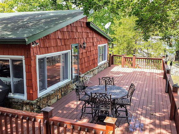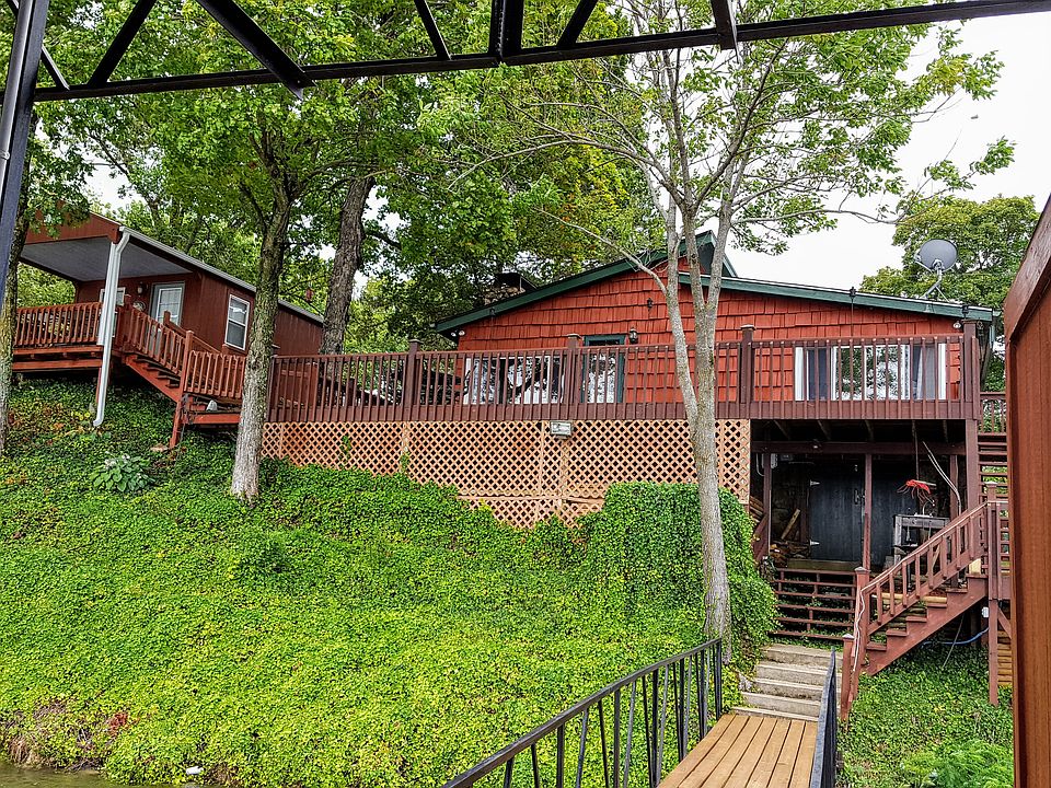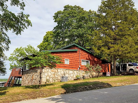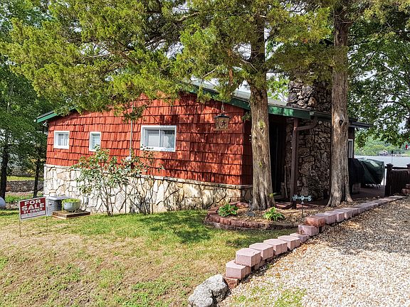 Amazing views from this great lake home. So cute inside and out! Cathedral ceiling in living room, kitchen and master bedroom. Open floor plan. Newly updated with carpet, slate floors in kitchen, new septic and stainless steel appliances. Blacktop to door, easy level lot on street side. Cove behind you and main channel in front. Easement on one side and vacant lot on the other. Guest quarters and storage located right off deck. Nice dock with swim deck, two 10 x 28 wells, one with 10,000 lb Polylift. This one won't last long! Call at 816-258-2388 or 816-456-0567. Feel free to stop by when you're in the area by boat or car! Open House Sunday 10--2 August 20th.