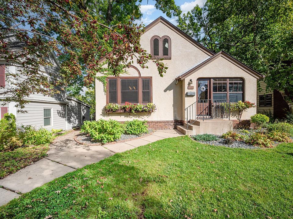 Nestled into the mature trees of the storybook St Anthony Park neighborhood awaits a masterfully renovated 1 1/2 story stucco gem with a 2023 built oversized heated and insulated 2+ car garage with attic storage trusses and EV Car charger set up.