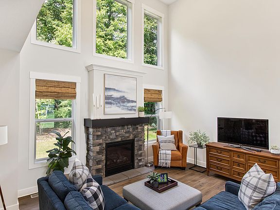 Located in the highly desirable Timberline Acres, this beautiful house is the perfect place to call home. With a bright and airy open-concept living, kitchen, and dining area, entertaining here is a breeze. Upon entering you'll first notice the living area complete with soaring ceilings, a gas stone fireplace that is surrounded by floor to ceiling windows and beautiful white oak laminate flooring that flows throughout the main level. The modern kitchen has stylish light fixtures, white quartz counters, subway tile backsplash, white shaker-style cabinets accented by a custom colored island, a walk-in pantry and more. Off of the kitchen, you will find the mudroom area, powder room, and convenient main floor laundry. Also featured on the main floor is a gorgeous owner's suite complete with tons of natural light, vaulted ceiling with architectural wood beam, ensuite bathroom with tiled shower and adjoining walk-in closet with custom shelving. Property is listing agent's personal residence