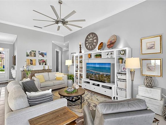 Set along a peaceful lake in the gated community of San Remo at Palmira, this 3-bedroom plus den, 2-bath home offers nearly 2,000 square feet of beautifully designed single-level living. A split floor plan enhances privacy, while the spacious great room takes full advantage of its setting with wide-open lake views. The light-filled kitchen, complete with a pantry, flows seamlessly to an inviting dining area, creating a natural hub for gatherings. The primary suite is a private retreat, featuring a dual-entry His & Her bath with separate vanities, soaking tub, and walk-in shower. Step outside to an extended panoramic screen-caged lanai designed for both relaxation and entertaining. Here, a heated spa, tranquil nighttime landscape lighting, and a propane fire pit set the stage for evenings overlooking the shimmering lake and water feature. Notable features include impact-resistant doors in the primary suite, a combination of electric and manual shutters, built-in cabinetry, a laundry room with utility sink, and an attached two-car garage. San Remo at Palmira is a welcoming community ideal for all ages—whether it’s young families, retirees, working couples, or anyone seeking a vibrant yet peaceful Florida lifestyle. Residents enjoy resort-style amenities including a clubhouse, pool, pickleball and tennis courts, fitness center, and scenic walking paths—all with convenient access to Bonita Springs’ pristine beaches, boutique shopping, and dining.