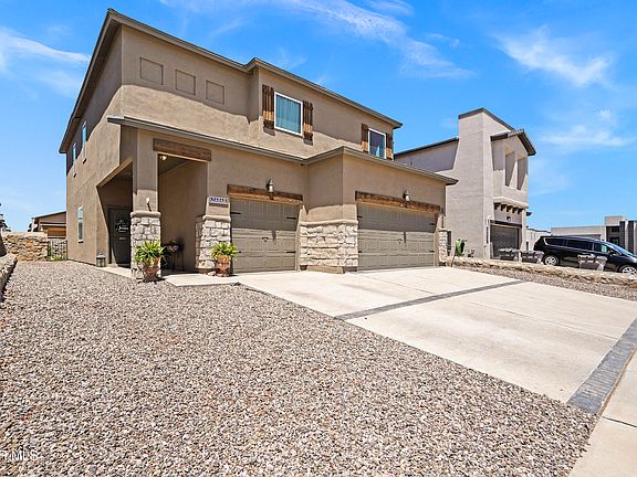 This spacious 5-bedroom, 2.5-bathroom home at 14849 Sam Garcia Ave in El Paso's Tierra Del Este subdivision offers 3,114 sq ft of modern living space. Built in 2020 by Zia Homes, it features a 3-car garage, granite countertops, farm-style apron sink, pot filler, and spray foam insulation. The home is equipped with refrigerated air conditioning and includes kitchen appliances such as a gas cooktop, microwave, and refrigerator. The backyard is walled for privacy and offers backyard access. Located near I-10 and Loop 375, it's just minutes from shopping centers and restaurants. This home would be perfect for a VA loan assumption with an attractive 3.375% interest rate and lower down payment necessary.