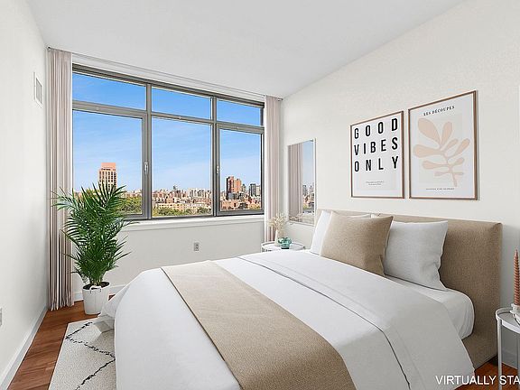 Discover unparalleled luxury in this exquisite three-bedroom, two-bathroom residence at the prestigious 5th on the Park Condominium. A gracious entry foyer welcomes you, leading past two queen-sized bedrooms and a sleek hall bath, into an expansive open kitchen. Culinary enthusiasts will appreciate the stainless-steel appliances, custom cabinetry, and convenient built-in washer/dryer. Both bathrooms are appointed with modern fixtures and recessed medicine cabinets. Floor-to-ceiling windows bathe every room in incredible natural light, enhancing the high ceilings and elegant hardwood floors throughout. The master bedroom suite offers generous proportions and two large, floor-to-ceiling closets, complemented by ample additional storage. Enjoy ultimate comfort with smart thermostats providing remote climate control, and designer blinds with blackout shades in all bedrooms ensuring privacy and tranquility.