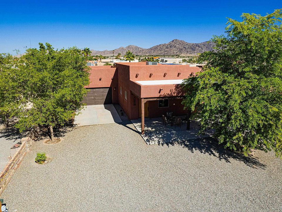 Entertainer's delight!  Tucked away in Yuma’s South Foothills, this Santa Fe-style home blends charm, comfort, and character. Inside, you’ll find handcrafted cabinetry, granite countertops, and warm finishes that highlight the home’s custom details. The spacious primary suite includes a jetted tub, walk-in tiled shower, dual copper sinks, and a generous closet with room for a reading nook or dressing area.  Enjoy the peaceful desert backdrop from the rooftop deck—accessible by a custom spiral staircase—or unwind on the covered patio beside the soothing fountain. With a two-car garage, RV hook-ups, and thoughtful craftsmanship throughout, this home offers a one-of-a-kind retreat near the mountains and golf.  Huge back patio with no direct sunlight, epoly floor with drains, beautiful light system, and planters. The back patio flows seamlessly into the oversized garage with 3/4 bathroom.