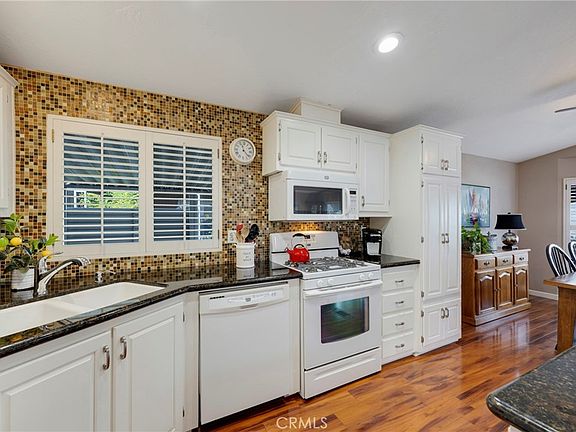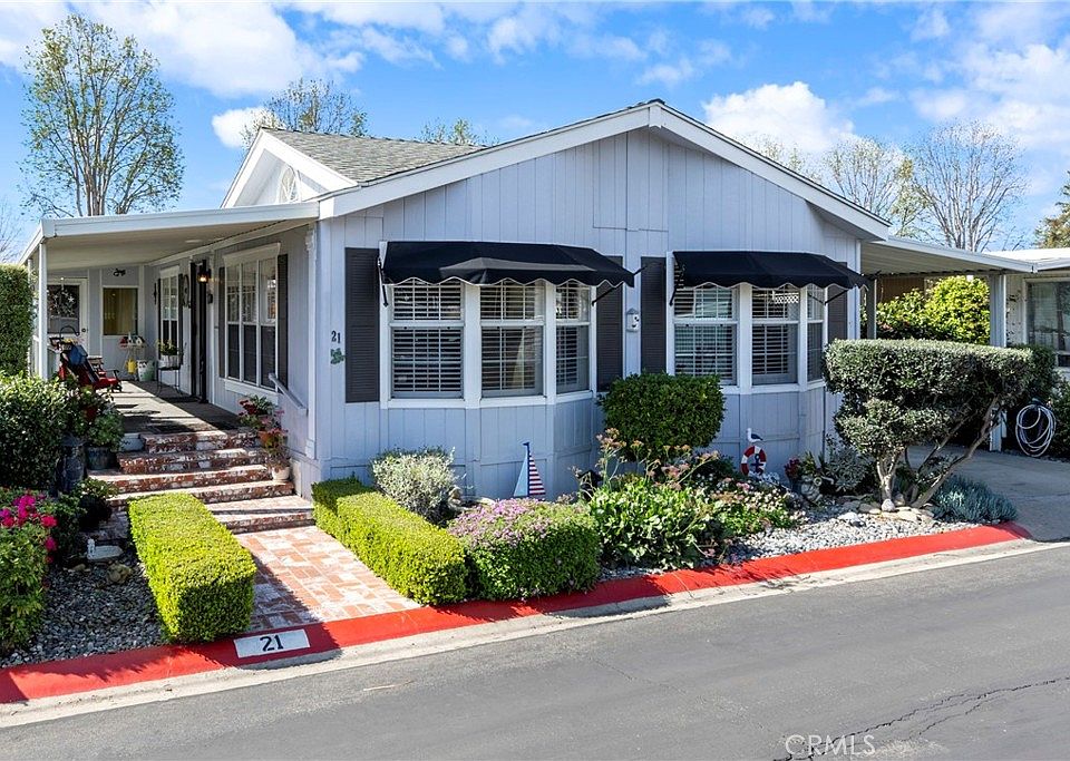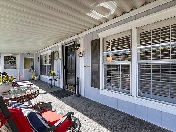 You won’t want to miss this beautifully updated home located in the Meadows 55+ Mobile Home Community in Irvine! This charming home welcomes you with a picturesque front porch and a delightful sunroom, perfect for soaking up the sun or pursuing your hobbies. Upon entering, you'll be greeted by an abundance of natural light streaming in through the surrounding windows and skylight, illuminating the open floorplan and gorgeous flooring. The kitchen features modern updates including newer cabinets and appliances, granite countertops, tile backsplash and LED recessed lighting. Plantation shutters adorn each window, adding a touch of elegance to every room. This home offers the added bonus of a versatile extra living space, complete with a cozy den, perfect for unwinding. The two bedrooms are generously sized, with the master bedroom providing ample space for a king-sized bed and featuring an ensuite master bathroom. Outside, the covered driveway accommodates two cars parked tandem and includes a sizable shed for additional storage. The Meadows community features a pool, a library with a reading room, and BBQ grills for your use. The Meadows is conveniently located near freeways and an abundance of shops, restaurants, and the city library. #21 at The Meadows is ready for you to call it HOME! You Will LOVE Living Here!
