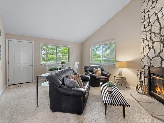 Discover this rare single-story, end-unit gem nestled in the heart of Moorpark! From the moment you step inside, you're welcomed by soaring vaulted ceilings and a stunning floor-to-ceiling stone fireplace that anchors the spacious living room with warmth and character. The bright and airy kitchen features light-toned cabinetry, sleek stainless steel appliances, a convenient breakfast bar, and a tucked-away washer and dryer for added functionality. The open-concept family room seamlessly connects to the kitchen and offers direct access to the serene backyard through a sliding glass door. Retreat to the expansive primary suite, which boasts two generous closets, an ensuite bath with a walk-in shower, and private slider access to the backyard—perfect for peaceful mornings or evening relaxation. The second bedroom is equally spacious and adjacent to a full guest bathroom with a tub/shower combo, making it ideal for guests or family. Enjoy outdoor living in the low-maintenance backyard featuring lush artificial turf, a custom stone gardening and BBQ area, and new vinyl fencing for privacy. Additional highlights include newer dual-pane windows, a detached two-car garage, and an extra parking space. The community offers resort-style amenities including multiple swimming pools, a clubhouse, and grassy play areas, creating a lifestyle of comfort and convenience. Don't miss this hard-to-find single-level home in a prime location!