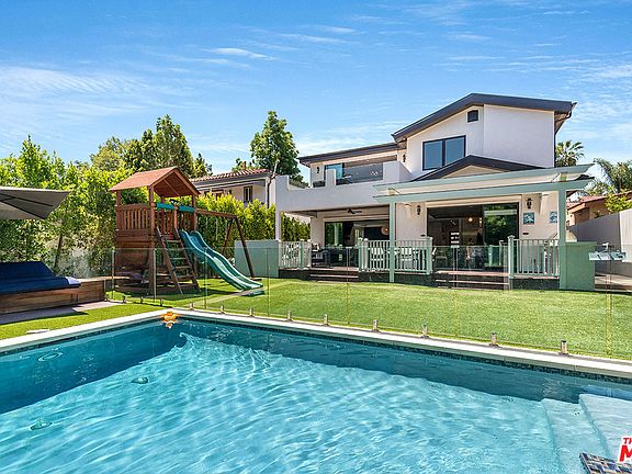 Stunning modern traditional home with unique, modern finishes provides beach feel in prime Sherman Oaks, south of Ventura Boulevard. Featuring an open floor plan with 5 BR / 5.5 BA in approximately 4,000 sq. ft. on an almost 7,500 sq. ft. lot. Gourmet kitchen with custom tilework, center island, Thermador stainless-steel appliances, and an eating area opens to family room with fireplace. Three sets of sliding glass doors lead to covered patio with in-deck lighting, fire pit with seating area, and barbecue. Steps lead down to spacious grassy area, built-in lounge seating, and pool/spa with waterfall feature. Floating steps with underglow lighting lead to a gorgeous upstairs landing with built-ins. Gorgeous master suite features fireplace, balcony, walk-in closet, and spacious master bath with custom tile and woodwork. This special home is completed with designer and entertainer details such as beamed ceilings, surround sound speakers, wine display, & Control 4 smart home system.