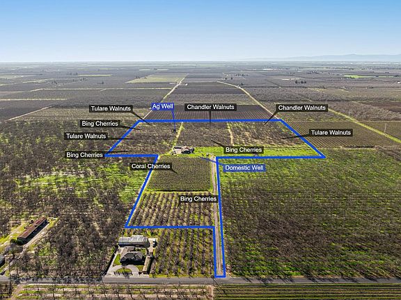 Prime Location, 47.89 Acres with combine Walnut & Cherry Orchards. Approx. 22.9 acres in Cherries, Coral & Bing. Approx. 20.8 acres Chandler & Tulare. Remaining approx. 5 Acres in roadway, bare ground, mobile home sites, old barn & nursery trees. AG Well, Domestic Well, Septic Systems.