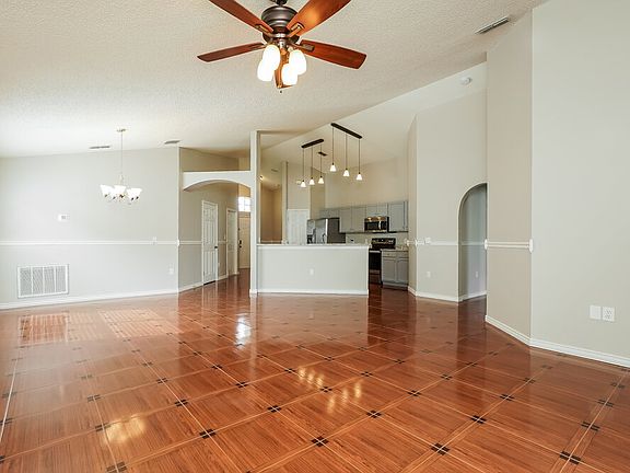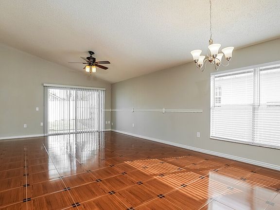 You'll enjoy relaxing on the covered patio of this four-bedroom, two-bathroom rental home in Orlando, Florida. Gorgeous flooring runs through the open main living areas of this abode, providing a dynamic design element. The living room includes a chandelier, a ceiling fan with a light, large side-facing windows, and a sliding door to the backyard, all contributing varying light options. Enjoy the ample cabinet space, stainless steel appliances, and visually-appealing triangular island in the kitchen, and a laundry room that's steps away. The main bedroom suite has two closets, making selecting outfits easy, and an en suite bathroom with a dual sink vanity and bathtub. Make plans for a tour today.