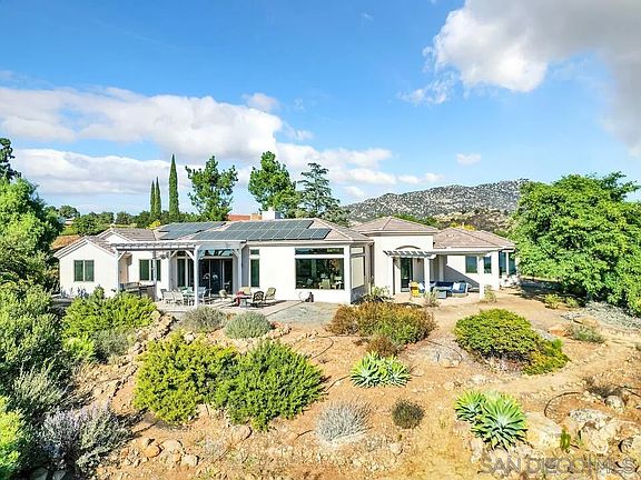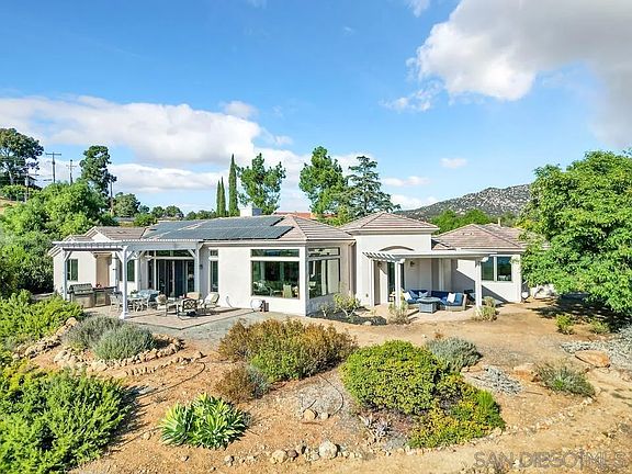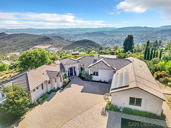 Welcome to this stunning custom-built single-story home nestled in the enchanting neighborhood of High Valley in Poway. This 4-bedroom, 3.5-bathroom premium construction residence, built in 2008, spans 3,211 square feet and sits on a sprawling 3.5-acre lot. Perched high on a hill, this home offers breathtaking 360-degree panoramic views, including stunning sunsets and ocean vistas on clear days, providing a serene escape with urban conveniences. An impressive entry is provided by the beautiful and long stone paved driveway. Once inside you are greeted by an pen and airy floor plan featuring high ceilings and large windows with translucent electric shades, ensuring an abundance of natural light. The oversized kitchen boasts a large island, granite countertops, Sub-Zero refrigerator, upgraded appliances, and a walk-in pantry. The great room features a built-in bar that can be discreetly closed off, while the primary suite offers spectacular views, dual bathrooms, and dressing rooms with closet organizers. Enjoy the energy efficiency of solar panels and dual AC units. The 2-car air-conditioned garage includes a work area for your projects. Step outside to the expansive patio with stone pavers and an outdoor kitchen, perfect for entertaining. Here, you can enjoy breathtaking sunsets while hosting gatherings. The landscaped grounds feature a cactus garden, native plants, mature trees, roses, and fruit trees, with walking paths throughout.