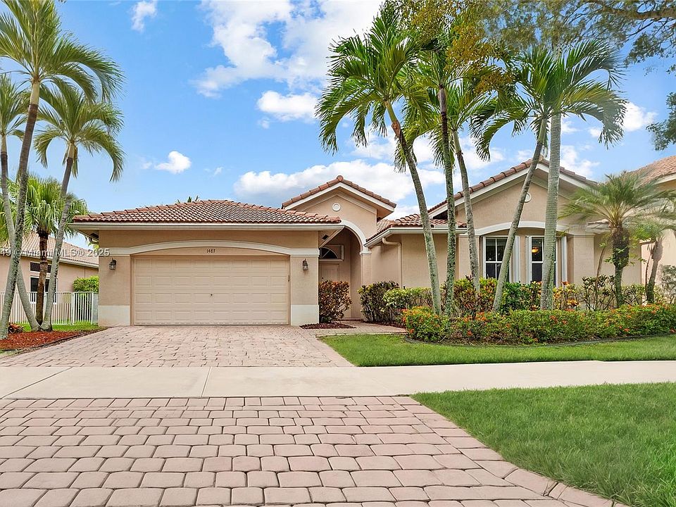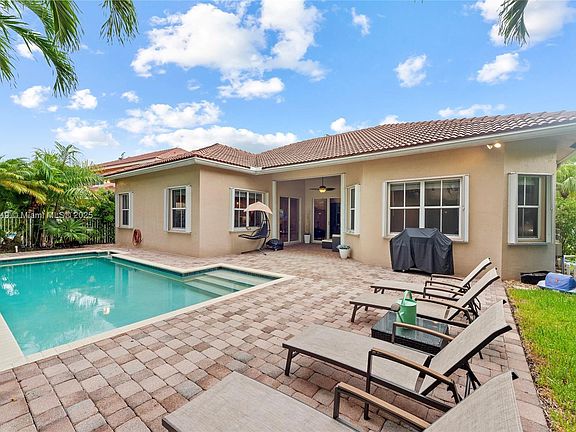 Renovated one-story in gated Savanna at Weston. 4 bedrooms, 2.5 baths, 2-car garage. Private pool with paver patio, covered sitting area, and a ficus-hedged, fully fenced yard. The kitchen was remodeled with a large island, granite counters, a pantry, and stainless steel appliances. Oversized diagonal stone tile flows through all living areas and bedrooms. Volume ceilings, foyer entry, French doors, crown molding, custom lighting, and an indoor laundry room. Spacious primary with walk-in closets, Roman tub, dual sinks, and separate shower. Full accordion shutter protection. Stroll over to Savanna’s community center with a heated lap pool and waterslide, and the clubhouse with a restaurant, tennis, pickleball, and more.