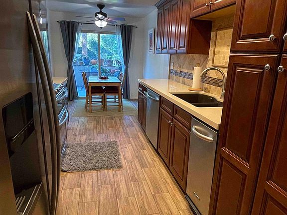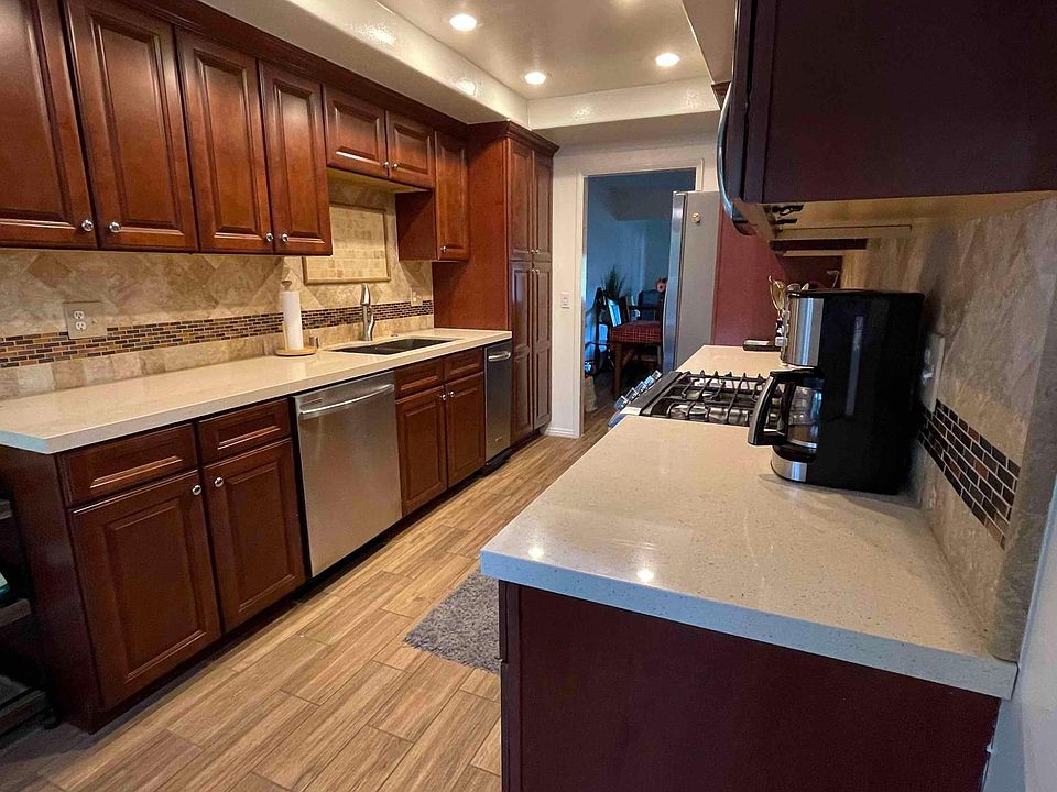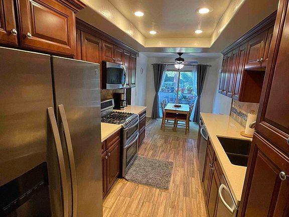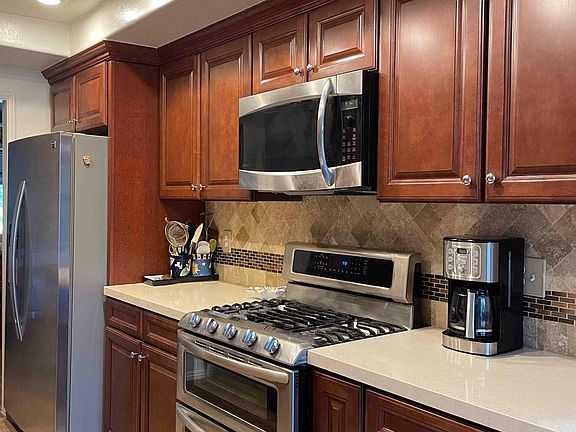 High Vaulted Ceilings, Beautifully Updated Kitchen, and Hardwood Flooring! A gorgeous, huge 2 bedroom, 2.5 bath condo available for February 1 lease start. This two-floor unit is one of the most updated in the entire La Habra Woods community: All new windows, hardwood/tile flooring throughout, and a fully updated kitchen with a gas range, trash compactor and French-door refrigerator. Unit also has TWO outdoor areas: a deck extending from the living room and a patio area visible from the kitchen. Split-level dining and living room can be used flexibly (e.g., play space, home office). The unit has an attached two car garage, in-unit washer dryer, master suite with double sink vanity, and central A/C and Heat. Fully renovated bathrooms throughout. The condo is nestled within a community with well-maintained landscaping and amenities including a pool, hot tub, and hilltop gazebo. Perfect location, Perfect home! Gas and electric not included. Owner pays water and trash. No smoking allowed. Rental application (including references) is required for property viewing and lease. Please apply via Zillow if interested with details about yourself and your co-tenants. Tenant pays first month and deposit prior to move in.
