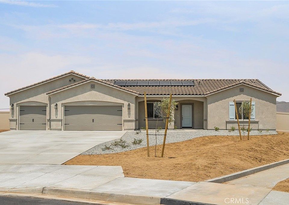 Make a lasting impression with this gorgeous new construction home in Apple Valley. Designed for modern living, this single-story home offers three bedrooms and two bathrooms, exuding charm and warmth throughout. The open-concept layout seamlessly connects the kitchen and family room, making it the perfect space for entertaining. Retreat to the master suite, which features a luxurious en-suite bathroom with a spacious shower and a walk-in closet. This home includes an array of high-end upgrades at no additional cost, such as granite countertops, energy-efficient kitchen appliances, a Wi-Fi-enabled garage door opener, solar panels, and more.