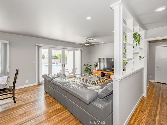 Inside, you'll find hardwood floors throughout, recessed lighting, and elegant French doors leading to a spacious backyard with a sparkling pool—perfect for entertaining or relaxing in the California sun. The stylish kitchen features sleek countertops, an Amana gas range and oven, and a Whirlpool refrigerator. Both bathrooms have been tastefully remodeled with Caesarstone countertops, and every room includes a ceiling fan for year-round comfort.