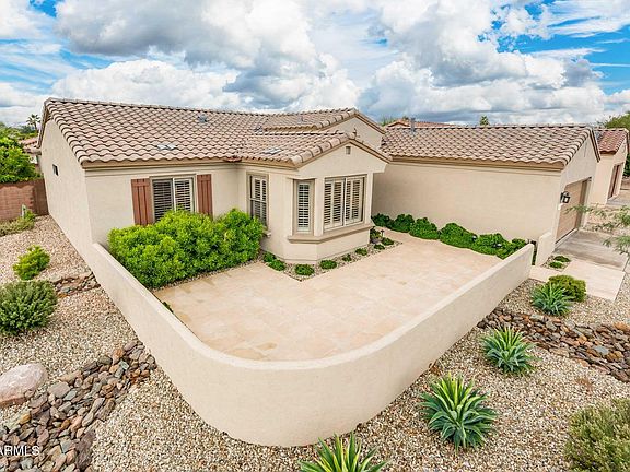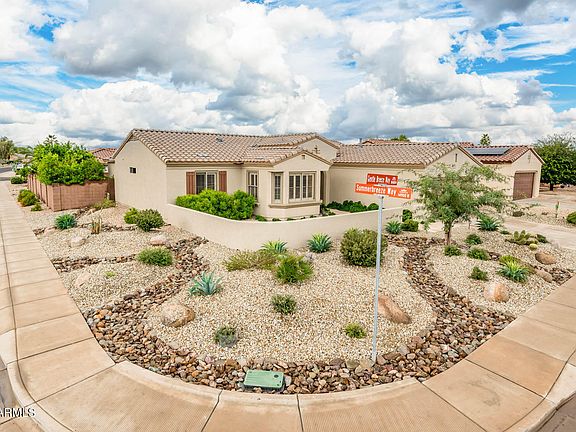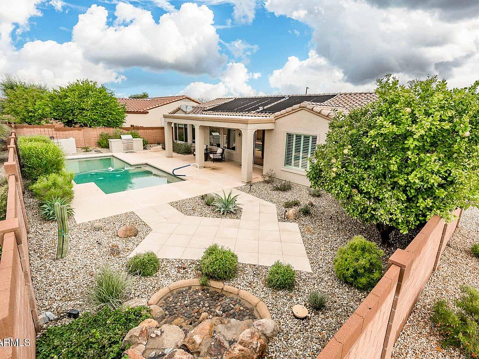 Highly desireable Borgata model featuring solar heated lap pool. Situated on a spacious corner lot, this home offers a new landscaping and hardscaping in the private walled backyard oasis and a charming front courtyard, ideal for morning coffee or entertaining guests. The bright, split-bedroom floor plan includes all-tile flooring, New underlayment on roof, a new water heater, newer HVAC system, and a 220V outlet in the garage. Located within the prestigious GRAND resort-style community, residents enjoy access to four championship golf courses, tennis and pickleball courts, softball fields, state-of-the-art fitness centers, on-site dining, a wide variety of classes, and more. Experience the best of Arizona living!
