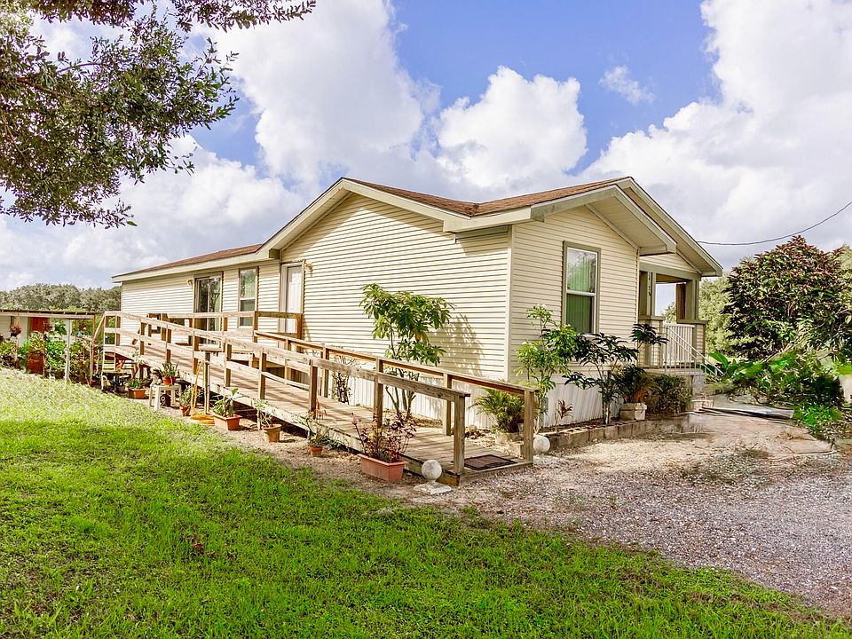 Viking - 2006 3 Bedroom, 2 Bath Palm Harbor manufactured home on 3.75 acres. This spacious property features updated laminate flooring throughout, a split floor plan, and an open-concept layout perfect for comfortable living. Dining room and inside Laundry room Enjoy the charm of mature trees, garden areas, a wood ramp, and two storage sheds for all your outdoor needs.If you've been dreaming of peaceful country life this is it! measurements are approximate.