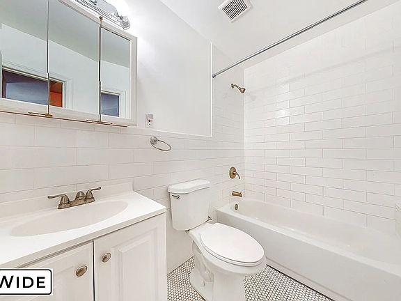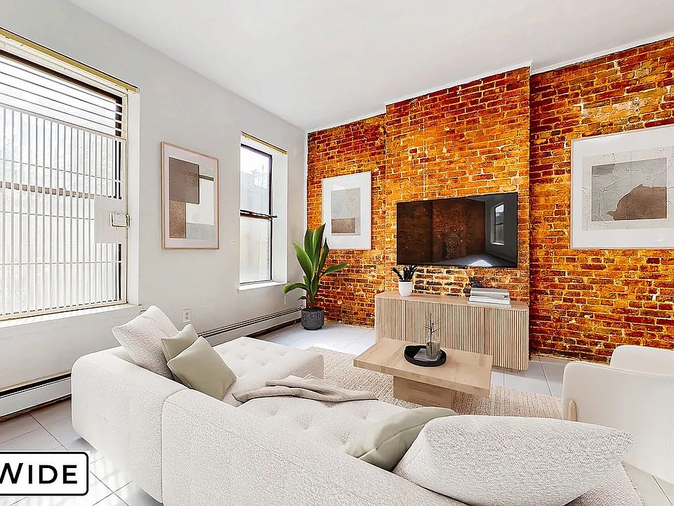 The expansive living room easily accommodates a full dining area, work-from-home space, and large sectional ideal for entertaining. The bedroom is king-sized with room for a full furniture set and includes a walk-in closet. The windowed bathroom provides extra storage and classic pre-war detailing.