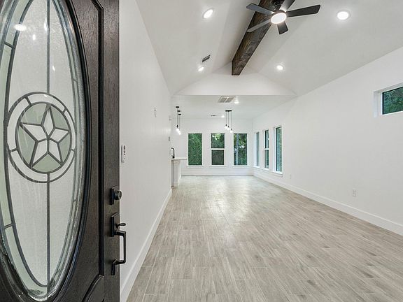 Come pick up the keys, this is the one! Home feels impressively spacious thanks to its vaulted ceilings accented with a beautiful wood beam, adding warmth and architectural character the moment you walk in. The open-concept layout seamlessly connects the living and dining areas, creating a perfect flow for entertaining and everyday comfort. Tall windows bathe the space in natural light, giving it a bright and elegant atmosphere. The kitchen is a dream, featuring a large island and abundant cabinetry, ideal for both functionality and style. The primary suite offers a large walk-in shower with a sleek glass door that brings a touch of luxury. The secondary bath continues the same modern, elegant feel. Enjoy a spacious backyard with a large covered patio, perfect for hosting or relaxing. Located in a community with lake access, you’ll love the balance of peaceful living and convenient proximity to HEB, popular local eateries, and HWY 45 just minutes away, yet it feels a world apart.