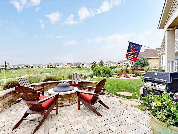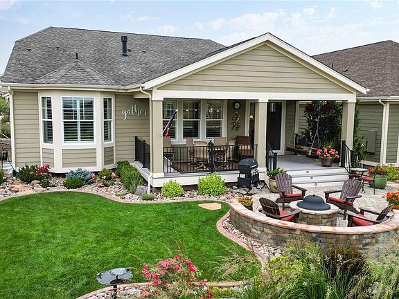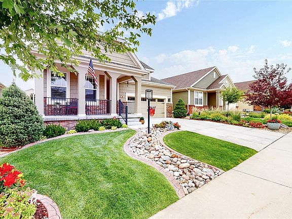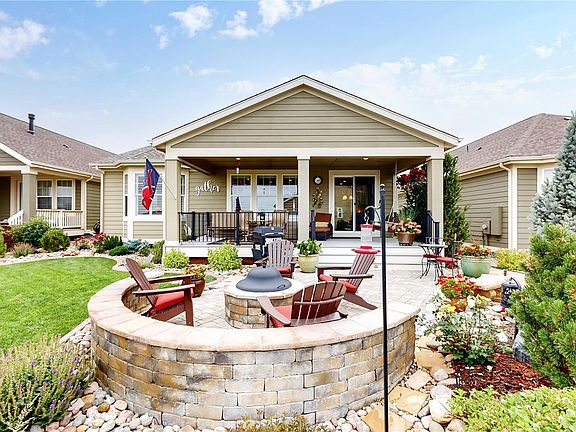 You don't want to miss seeing this immaculate home in the highly desired gated golf course Heritage Todd Creek 55+ community! This beautiful home shows pride of ownership and care in every detail. Amazing golf course location with views from the extended back porch and primary bedroom, and mountain views from the front patio! Entertain or relax on the back porch surrounded by flagstone patio, gas firepit with half wall, gas grill and master designed landscaping filled with beautiful flowers surrounding your retreat. This gem is a true private oasis. Home is immaculately maintained and move in ready. The open great room floor plan boasts engineered hardwood throughout, plantation shutters and gas fireplace with beautiful stonework. The gourmet kitchen features beautiful white cabinets with grey granite throughout, large island, stainless steel refrigerator, dishwasher and dual ovens with large pantry. Primary bedroom has large bay window that look out to golf course with the privacy of being located on the corner of the green. En Suite bathroom has granite counters, large shower, dual sinks and large walk-in closet. Second full bathroom includes tub/shower combo, granite counters and beautiful finishes. Third bedroom is currently staged as an office area with beautiful french doors opening to the room. The large main floor laundry room has washer and dryer included with built in cabinets and utility sink. Garage has 2 parking spaces with storage nook and has been upgraded to include finished walls and ceiling, epoxy flooring and tool racks. Basement is unfinished and offers potential for finishing and growth if desired. This home is located close to the clubhouse which includes golf course, tennis courts, fitness center, outdoor pool, indoor pool, patio, firepit, restaurant and many community events! Don't miss out on your chance to be a part of this beautiful 55+ community.