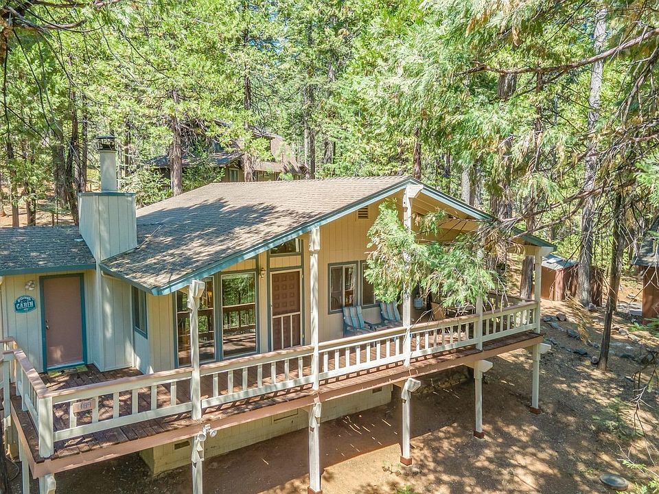 Super cute Blue Lake Springs cabin. Single level with 2 bedrooms and 1 bath. Open floor plan with vaulted wood ceilings. Separate laundry/mud room with exterior access. Nice covered porch to enjoy the large deck year round. Located on one of the best streets in Blue Lake Springs. Very close to Big Trees State Park. The property behind this property backs to the park. Great hiking!