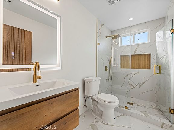 Stylishly updated, this 3-bedroom, 2-bathroom home offers 1,198 sq ft of living space on a gated 5,798 sq ft lot that feels much larger. The open kitchen showcases custom white oak cabinetry, quartz counters, LED under-cabinet lighting, and a central island crowned by a designer chandelier-the true heart of the home. Baths are beautifully remodeled, including one with a floating quartz sink. Major upgrades include new roof, windows, HVAC, plumbing, electrical, and more. A spacious yard with ADU potential completes this turnkey residence.