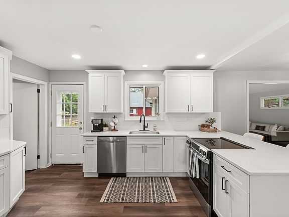 Stunning quartz countertopsBright open layoutStainless steel appliancesBreakfast barCozy wood-burning fireplaceDining areaAmple cabinetry
