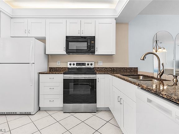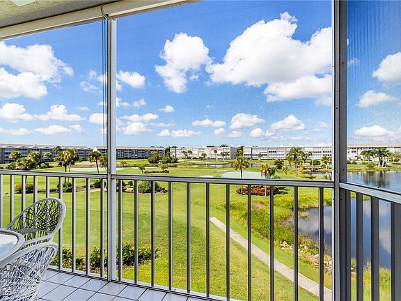 When you enter this 3rd floor 2 BR 2BA condo in MUIRFIELD @ Golfview you'll understand why it is described it as having "MILLION DOLLAR VIEWS!". The private lanai overlooks the water and the entire course but more specifically the 5th & 6th tees and greens. The sunset views are MAGNIFICENT from the lanai and the master bedroom w/bay window vistas. The property has plantation shutters throughout. It is neat as a pin and clean as a whistle. Underfoot, it has LUSH neutral carpeting in living and bedrooms with diagonal tile in kitchen & baths. The lovely leather living room furniture, dining set, and bedroom room furniture as well as the housewares & linens are included with this property. The kitchen is completely updated with new shaker style cabinets, it boasts an updated ceiling with contemporary light fixture and accent lighting, too. Granite counter top, undermount stainless steel sink with gooseneck faucet and soap dispenser, SS range. There is a Stainless Steel Lazy Susan in the corner cabinet. Master and guest bathrooms have new vanities, counter tops, mirrors, lights, faucets & toilets. The 'big ticket items' are updated for you. Golfview is conveniently located near Lakes & WaKaHatchee Parks & Recreation Centers, BBMann Performing Arts Hall, Suncoast CU Arena, world-class shopping and dining, the fabulous and refurbished beaches of Sanibel/Captiva and Fort Myers. RSW and PGD airports are short drives away. Medical facilities and houses of worship are also nearby. Many of these points of interests are walkable from Golfview. Muirfield has VERY reasonable monthly fees which include UNLIMITED GOLF (no additional green or tee fees) and use of its other amenities: 3 POOLS, Lighted TENNIS & PICKLEBALL COURTS, and more - WATER SEWER, EXPANDED CABLE, INTERNET & WIFI, Onsite Management, etc.! Buy this property now and you can enjoy the 2026 SEASON in PARDISE!