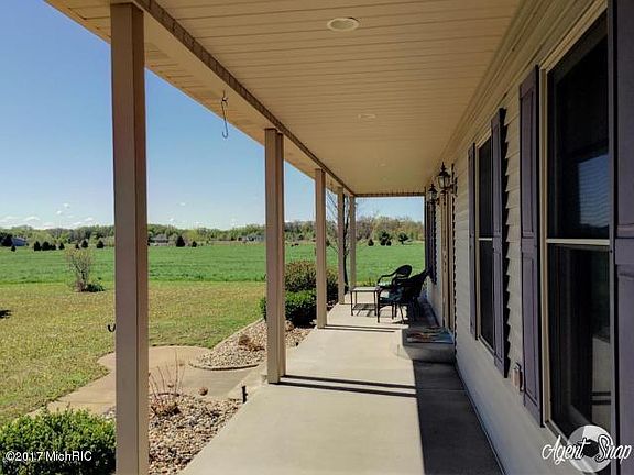 This gorgeous custom built 3-4 bedroom country home, situated on over 21 quiet acres in the Buchanan School District, features stunning views both inside and out. Sip your morning coffee on the covered wraparound front porch and enjoy panoramic views of alfalfa fields and green pastures. Inside the home you will find soaring cathedral ceilings, beautiful wood floors, a home office space, and a large carpeted bonus room above the garage with built-in bookshelves (33x18). The freshly painted wallsof the living room, kitchen, and office, combined with the warmth of the brick hearth gas fireplace make for a welcoming environment for entertaining friends and family. The basement is ready to be finished with plenty of storage space and 9' ceilings. The 36x52 pole barn with electric, water (MORE