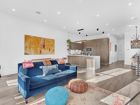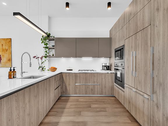 The chef's kitchen is a standout, outfitted with premium appliances including a Fisher & Paykel French-door refrigerator, Bertazzoni gas cooktop, dual 24-inch wall ovens (one with microwave capabilities), a Miele dishwasher, and a Moen faucet. Sleek imported Miton "Sincro" wood cabinetry is paired with striking white Calico quartz countertops and a matching backsplash to create a modern, cohesive look. The bathrooms are equally refined, featuring Brizo fixtures, marble accents, and polished porcelain tile. A full laundry room offers additional convenience, along with excellent closet storage throughout.