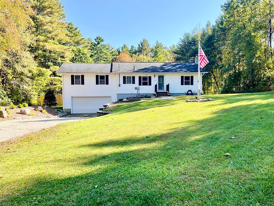 Welcome to this expansive ranch home set on 2 acres, offering two full levels of versatile living space! The main level highlights a spacious tiled eat-in kitchen with a center island, stainless steel appliances, and lots of cabinet space. A spacious room with vaulted ceilings is currently being used as the master suite but could also easily be converted into a living room or dining area to suit your needs. Two additional bedrooms and a bonus room off the kitchen provide flexibility for a home office, den, or fourth bedroom. The lower level includes a full bath, laundry, a cozy fireplace, and direct access to both the garage and backyard—ideal for use as a family room, teen suite, guest area, or playroom. Outside, enjoy your own private retreat with an above-ground pool, fire pit and space for all your outdoor activities. Plus, excellent storage with a 1.5 car garage and oversized shed. Amazing opportunity for country living with easy access to Worcester, Boston, and major highways!