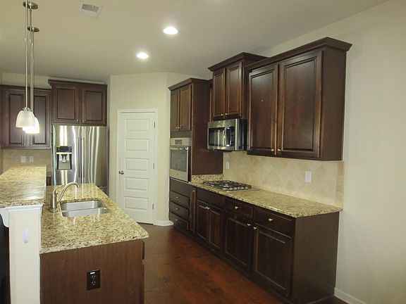 Modern kitchen with stainless steel appliances (Refrigerator, Stove, Microwave, Dishwasher)