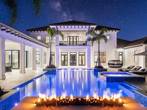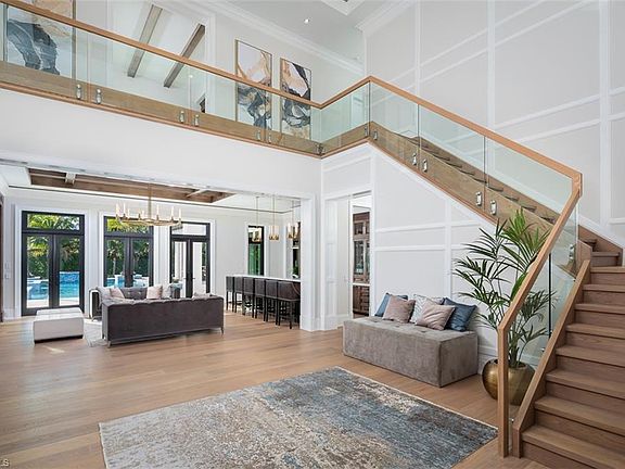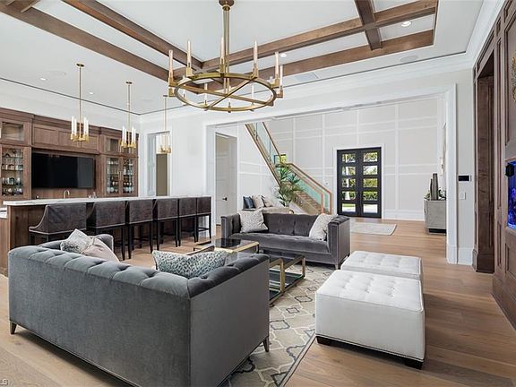 This exceptional newly constructed home on Cajeput Drive is a showcase of timeless elegance that will exceed the expectations of even the most discerning buyers. Simply put this Estate checks all the boxes. Boasting five bedrooms, a den, and eight bathrooms, designed with entertaining in mind. As you step inside your grand foyer, you will be greeted by a spacious glass and hardwood staircase, a billiards room, a see-through aquarium, and a magnificent marble bar with ample seating. The main floor features your master, two offices, a chef's kitchen, an oversized bonus room, a VIP suite with private lanai, two laundries and a resort-style pool with a sunken fire pit. The extensive covered lanai revolves around a linear fireplace and includes a large outdoor bar with a kitchen and a dedicated pool bathroom. Upstairs, there are three ensuite bedrooms, your third laundry and den with a cozy balcony overlooking your pool. This home has been lightly lived in for less than six months and is ready for you to call it your own.