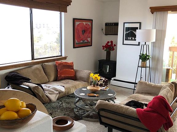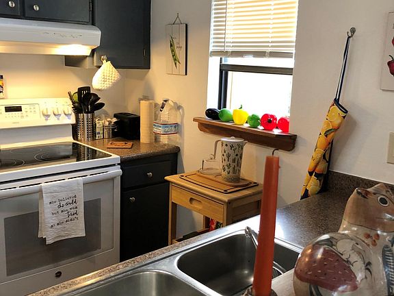 6 MONTH LEASE PREFERRED. UPSTAIRS, TOP-FLOOR, END UNIT WITH SUPERB LIGHT AND VIEWS AND AC! CLEAN & BRIGHT, CONTEMPORARY & FULLY FURNISHED TURN-KEY CONDO WITH STYLISH LIVING AREA ADORNED WITH SOUTHWESTERN ART, 2 COMFY FUTON COUCHES, SMART TV, 4 TOP DINING AREA WITH ELECTRIC FIREPLACE THAT ADDS AMBIENCE AND WARMTH N THE WINTER. ENJOY COFFEE OR COCKTAILS ON THE BALCONY OVERLOOKING THE QUIET ARROYO AND SURROUNDING MOUNTAINS. KITCHEN HAS A PASS-THRU WINDOW CONNECTING THE LIVING/DINING SPACE AND IS FULLY EQUIPPED WITH DISHWARE, COOKWARE, MW, COFFEE MAKER, TOASTER, BLENDER, COOKTOP RANGE, DISHWASHER & FRIDGE. LAUNDRY & STORAGE CLOSET/PANTRY WITH STACK W/D. SPACIOUS BEDROOM WITH NEW QUEEN MATTRESS AND 2 DRAWER PLATFORM BED. SHOWER OVER TUB BATH WITH LARGE MIRRORED VANITY/SINK. INCLUDES ALL UTILITIES, CABLE/INTERNET/WIFI. CONVENIENT, DEDICATED PARKING SPACE SUPER CLOSE TO UNIT. 10 MINUTES FROM EVERYTHING! EASY ACCESS TO SHOPPING AND HIKING.