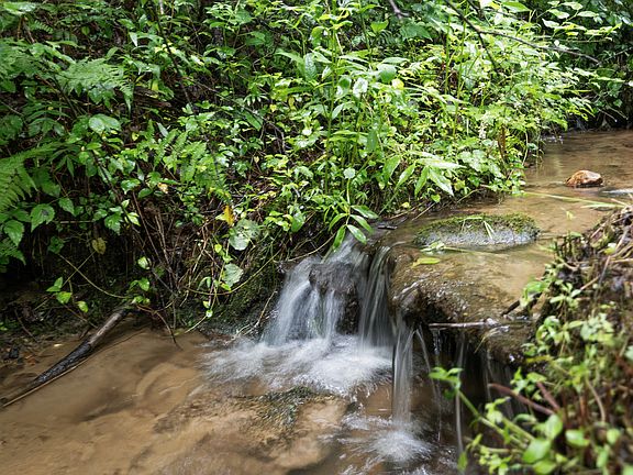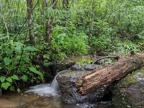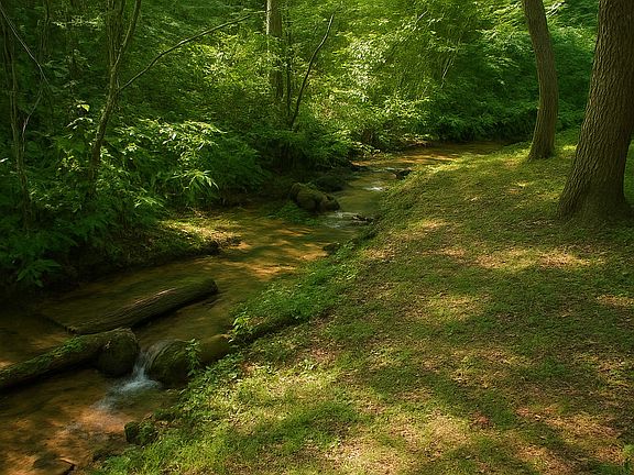 Gas-log fireplaceModern upgradesMarble islandSoaring ceilingsHardwood floorsCreekside sitting areaBrand-new hot tub