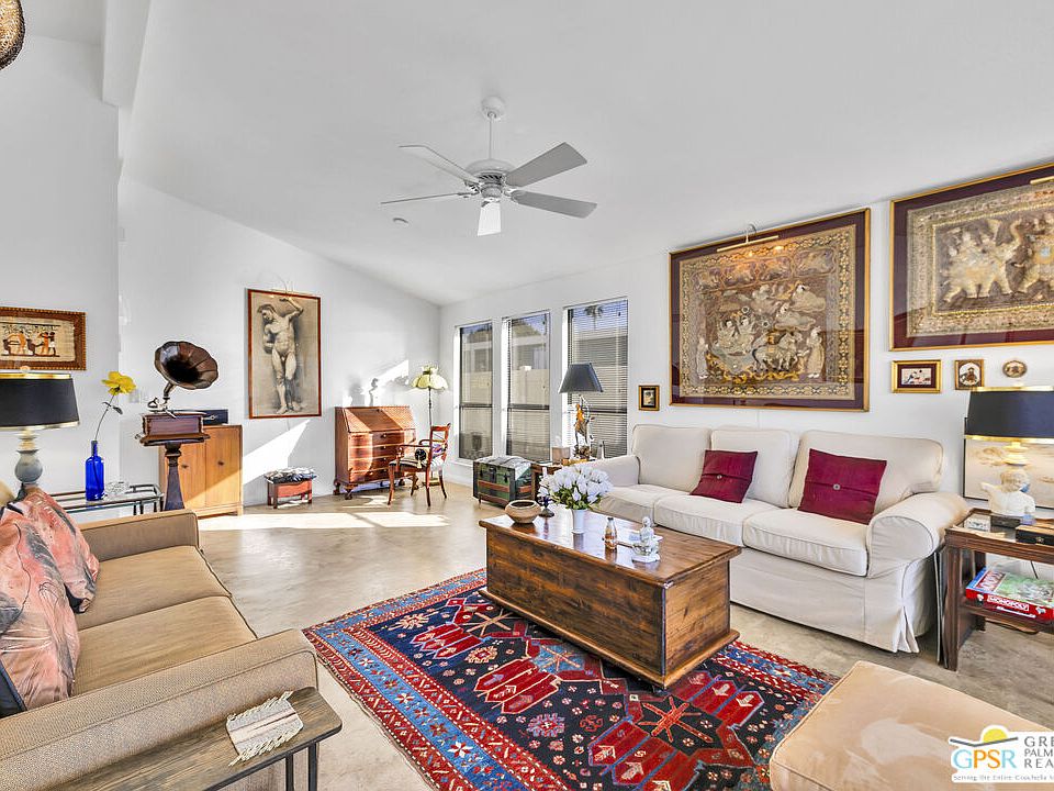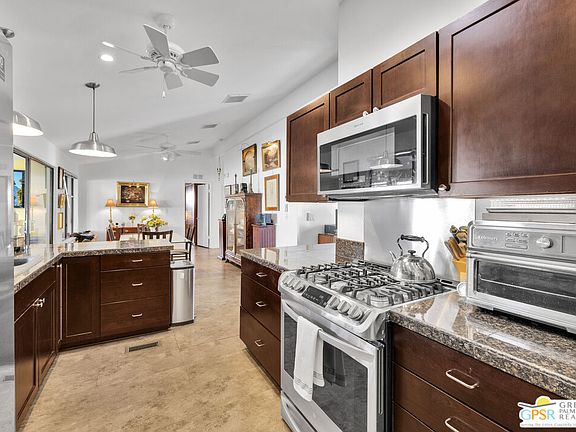 Location + Garage + Solar = A fantastic opportunity at The Canyon, one of the area's most desirable mobile home communities. This spacious 2 Bed / 2 Bath home with a bonus sunroom offers 1,558 sq. ft. of comfortable, well-maintained living space. With drywall throughout, recent updates include: new water heater, garage door, and garage insulation (2024) - new kitchen appliances; gas range, refrigerator, microwave, and dishwasher (2020) - new AC coil and furnace (2021) - new AC/heater mini-split in sunroom, new electrical panel, and patio misting system (2019). From the cozy living room, take in the mountain views and gorgeous desert sunsets. The kitchen features granite tile countertops and custom cabinetry. The large primary bedroom with ensuite bath creates a private retreat within the home. The primary and guest baths both offer granite countertops and custom cabinetry, with the primary bath featuring dual sinks. The bonus sunroom offers versatile possibilities and features a gas fireplace. Energy efficiency is a highlight with 20 leased solar panels installed in 2020 by Sunrun, and a vented evaporative cooler, helping keep energy bills low. Enjoy the convenience of the laundry room adjacent to the attached two-car garage. Outside, the private, fenced backyard includes an electric patio awning and two mature citrus trees. Community amenities at The Canyon include two sparkling heated pools and spas, tennis & pickleball courts, a welcoming clubhouse with library/card room, billiard/game room, fitness room, crafts room, indoor shuffleboard, and a beautiful multi-function room with a stage and professional-style kitchen, ideal for events. This home is conveniently located on a quiet street, just one block away from the clubhouse. The Canyon is a gated, well-maintained 55+ community. Buyers must obtain park approval, which requires a minimum 750 credit score and proof of income three times the monthly space rent of $995. One pet up to 20 lbs is permitted. Buyers and their agents to verify current space rent and square footage. With PSP Airport, shopping, and restaurants just minutes away, this home is perfect for year-round living or as a vacation retreat.