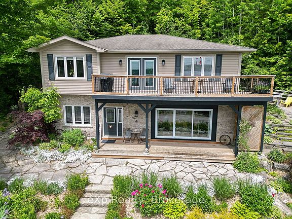 This outstanding waterfront home on Colpoys Bay offers a year-round, 5-bedroom, 3-bath family haven in a natural setting. Just five minutes from Wiarton, and an easy drive to Sauble Beach and Owen Sound, the location strikes a rare balance: close to everything, yet quietly removed. A beautifully conceived reverse floor plan puts the open kitchen, dining, and living spaces upstairs, where expansive windows and a generous deck capture water views. A lovely bedroom with ensuite, two additional bedrooms, and a full bath complete this level. Downstairs, the primary suite is stunning with its beamed ceiling, fireplace, custom live edge cabinet and floating shelves. A sliding glass door opens to a covered verandah overlookingthe gardens and the Bay beyond. The sleek three piece ensuite spans the width of the bedroom and features a glass shower and copious closet space. Across the wide hall, an inviting fifth bedroom with waterview makes hosting guests a delight. Laundry, utilities and storage are tucked away at the back of this level. Outside, the landscaping is lush and low-maintenance, with perennial plantings that frame the home and outdoor living areas. Across the quiet road on a private slice of waterfront sits a cool bunky, its sliding glass door overlooking the deck, the dock, and Colpoy's Bay. Everything here, both inside and out, is pleasing to the eye. Whether you're an active family looking for a full-time home or empty nesters wanting a place to gather with kids and grandkids, this impressive property is waiting for you. Upgrades include New Roof (July 2025), New UV System and New Foot Valve for lake intake pipe.