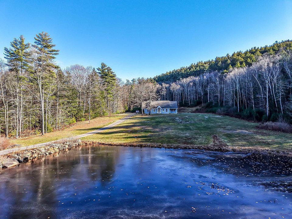 Come to discover this custom contemporary Cape, set on 7.8 private acres overlooking a peaceful pond, offering the perfect blend of comfort, character, and natural beauty. The first floor features a spacious primary suite with its own bath, hardwood floors throughout, and a stunning kitchen with granite counters and newer appliances highlighted by warm wood-beam ceilings. Enjoy the expansive family room with cathedral ceilings and skylights, plus a bright four-season sunroom with floor-to-ceiling windows that bring the outdoors in, enhanced by a propane stove, offering a relaxing and cozy atmosphere. Additional features include a spacious garage with loft storage that could be converted into extra living space, plus a generous basement. A truly unique property offering space, privacy, and exceptional craftsmanship. Recent updates: newer windows, fridge and many others to mention.