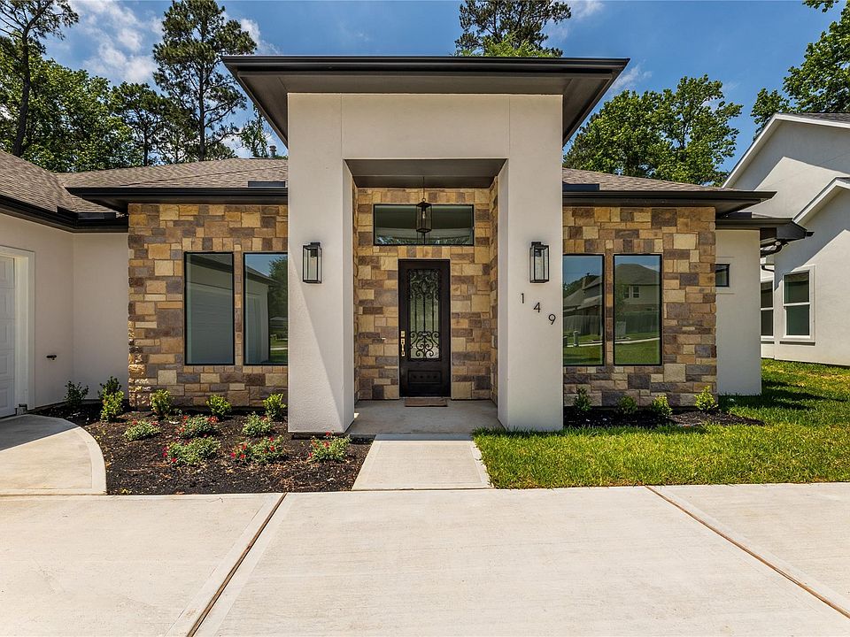 property currently has a one year lease in place .Exquisite Ranch Style stone and stucco Home! Enjoy the open concept living with High Ceilings, Large Windows, and a Covered back porch overlooking the picturesque wooded backyard. The Kitchen boasts Quartz countertops, a spacious island, and Stainless Steel Appliances. All bedrooms have their own bath in this one-story beauty. Located in a gated Golf Course Community with lake access and community pools. Oversized Garage. Live in luxury in this waterfront community wi/black hardware and light fixtures throughout, creating a modern and elegant atmosphere. Great wooded view out the back of the home, Solid surface floors throughout. Each bedroom has its own private bath. Stainless steel appliances. Large walk in showers,Primary suite has walk in shower as well as free standing soaker tub. 24 hr manned gated community. Enjoy the full spa experience, 3 golf courses, multiple tennis courts, pickle ball courts, beautiful gym,dog park and more
