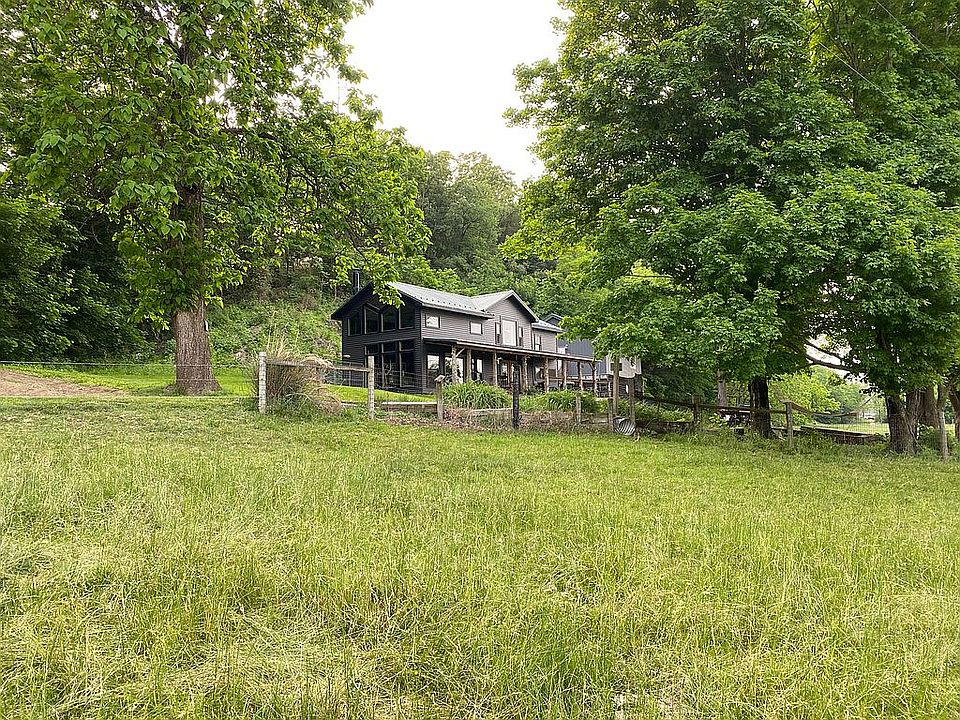 The vaulted great room has expansive pastoral and river views with a wood-burning fireplace and concrete slab in-floor radiant heat!