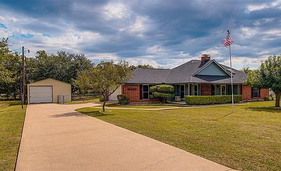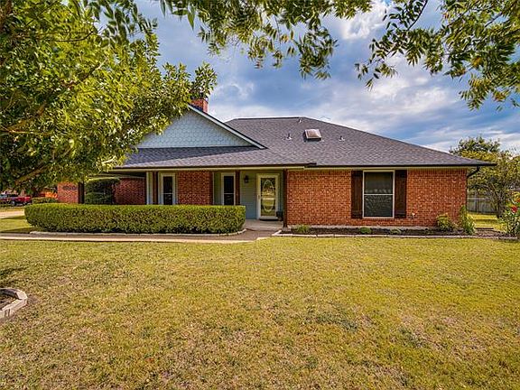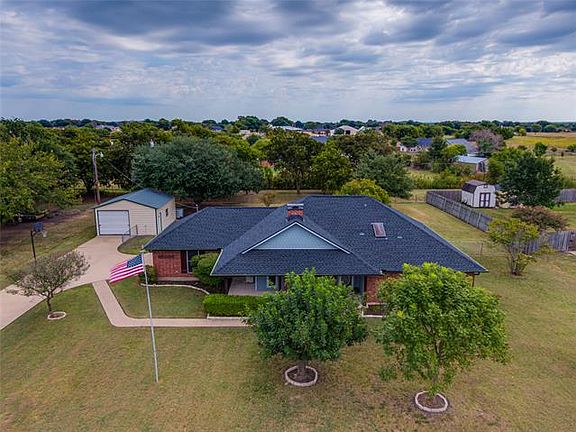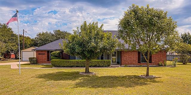 Pretty brick home with inviting front porch. Enjoy the open concept living space, kitchen and dining with new wood look tile floors. Kitchen has been updated with new appliances and refrigerator to stay. Bathrooms boast tile flooring & tiled showers. The living room has a wood burning fireplace and a really nice built-in bookshelf. The master bedroom has a Tres ceiling and on suite bath with separate vanities, a line closet and walk in closet. The other 2 bedrooms are spacious. The back covered patio is a good size and the backyard backs to a greenbelt with trees. A 24 x 20 shop with electric is a bonus. Brand new roof & gutters added 7-2021. Outside trim & shutters have been painted recently. Move in ready!