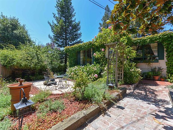 Most charming, enchanting property in a while.Owners have worked to cultivate a magical garden & keep the integrity of an English style cottage.This spacious,private lot is bathed in sun w/paths to many sitting areas to relax & dine&its own cluster of redwoods.Street-to-street lot w/gated ent. at back leads to a brick driveway&2-car gar.Great parking! Outbuilding cottage w/ bath.